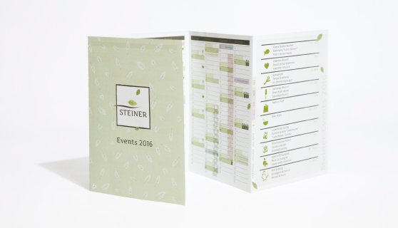 GENIESSER AUFGEPASST! Passend zu den Promokarten wurde ein dreisprachiger Eventkalender entwickelt, der über die Dauer und Art der Events Auskunft gibt. Um einige Events besonders hervorzuheben, dient eine ausführlichere Beschreibung auf der Rückseite. Das Format hat die Größe des Personalausweises und kann deshalb bequem in die Geldtasche gesteckt werden.