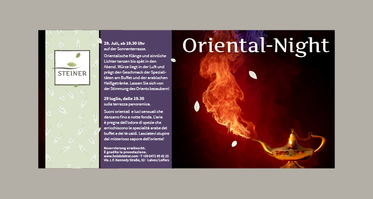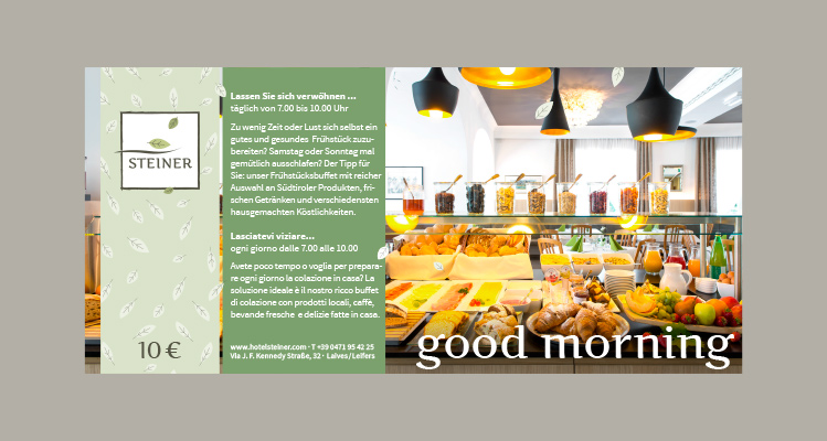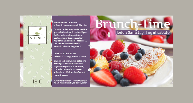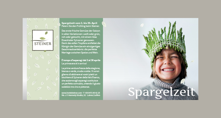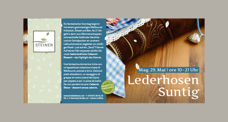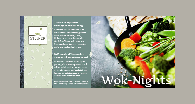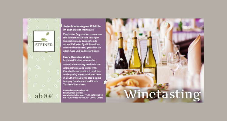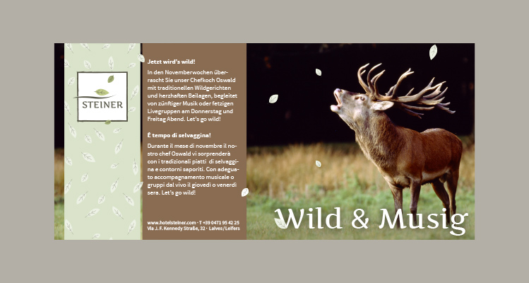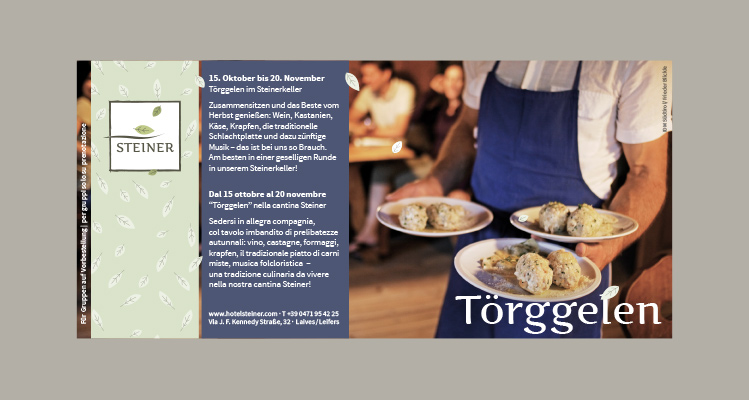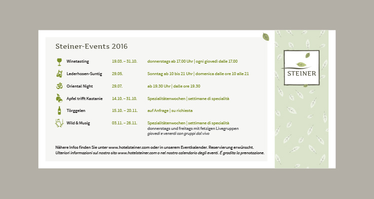 POINT OF INTEREST. Für Steiners Spezialevents wurden Promokarten gestaltet, die an der Rezeption und im Restaurant aufliegen. Die natürliche Haptik und Stabilität der Karten laden zum Mitnehmen ein - wichtig für eine stetige Verbreitung.