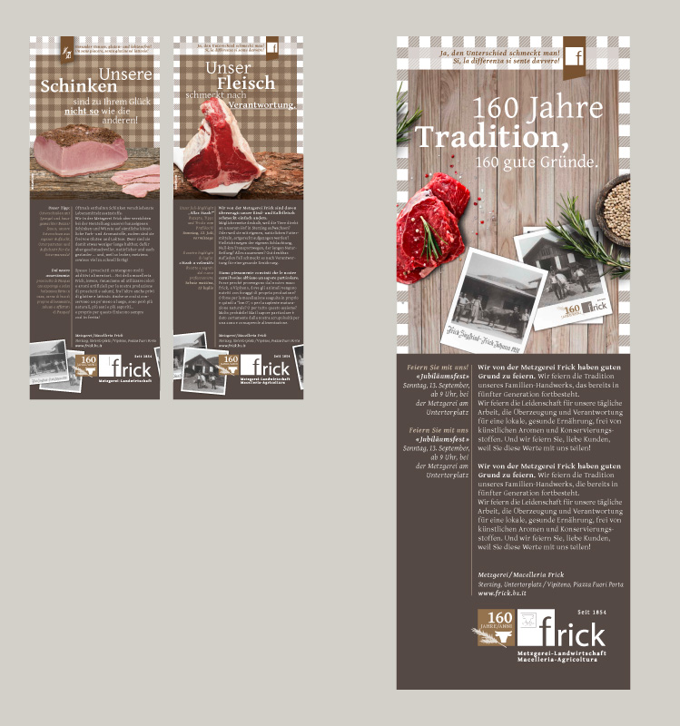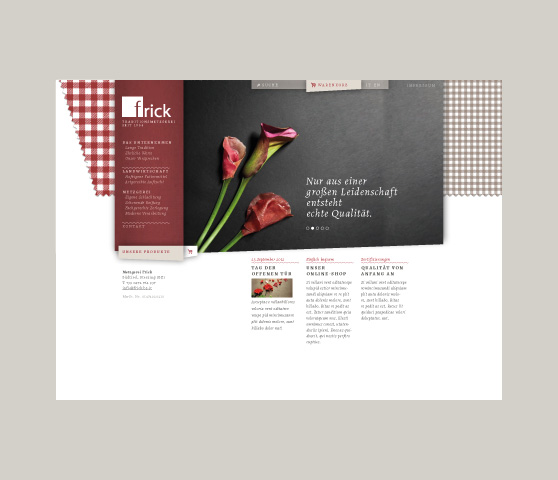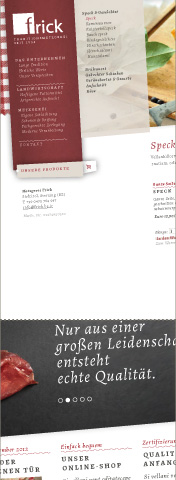 FRISCHE IDENTITÄT. Die Anforderung an den Internetauftritt für die Fleischerei Frick war die Hervorhebung der Qualitätsprodukte, gemischt mit der Persönlichkeit des traditionsreichen Familien-Betriebs. Konzeptfotografie und die charakteristische Karooptik aus dem Corporate Design stellen die weiteren Besonderheiten dar. Der integrierte Online-Shop ist zudem ein für die Frischebranche eher seltener, und deshalb von den Kunden umso höher geschätzter Mehrwert der Website.